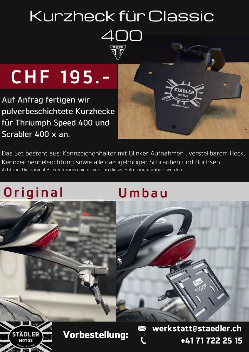 Als offizieller Motorradhändler für die Premiummarken TRIUMPH, CFMOTO und VOGE im St. Galler Rheintal dreht sich bei Städler Motos alles um Fahrspass und pure Emotion – und das auf der Überholspur! Ob Verkauf von Neu- oder Occasionsfahrzeugen, Eintausch, An- und Verkauf im Bereich Motorradtuning oder Reparatur und Unterhalt, Ersatzfahrzeuge, Bekleidung und Accessoires bis hin zu Zubehörteilen und Belangen des Pneu-Centers - bei uns profitierst du von Qualität und Service-Expertise seit 1980.